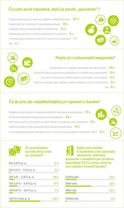 Ak výsledky prieskumu naznačujú, že Slovákom ide len o zisk, ide o mylnú predstavu. Takmer 7 z 10 opýtaných si totiž pri slove „sporenie“ najčastejšie v mysli vybaví zodpovedný prístup, nutnosť a potrebu odkladať peniaze. Len zlomku z nich napadne nesplnený sen, ktorý si v súčasnej situácií nemôžu dovoliť a niektorým sa dokonca vynorí predstava prasiatka s otvorom na hádzanie mincí. A čo by s nasporenými peniazmi urobili? Necelá polovica opýtaných by úspory použila na horšie časy. Zmysluplne by peniaze investoval aj zvyšok respondentov, keďže 12 % z nich by nimi splatili hypotéku a ostatné dlhy, nasleduje kúpa auta, vzdelanie detí či vybavenie do domácnosti.