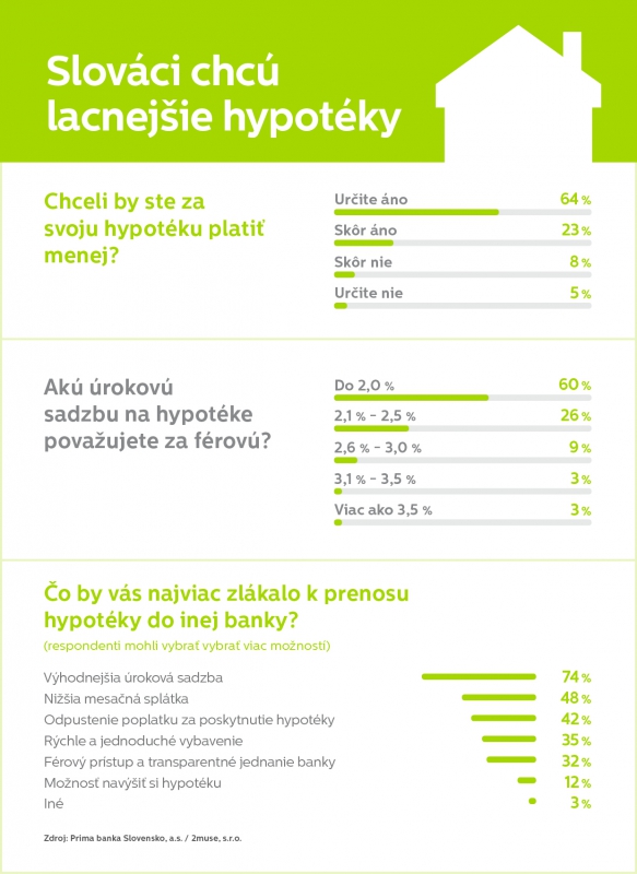 Podľa prieskumu by najviac Slovákov (74 %) k prenosu hypotéky do inej banky zlákala výhodnejšia úroková sadzba, za ňou s väčším odstupom nasleduje nižšia mesačná splátka a odpustenie poplatku za poskytnutie hypotéky. Klienti však uvažujú aj prakticky a chcú sa svojej nevýhodnej hypotéky zbaviť bez zbytočného čakania a komplikácií. Až 35 % ľudí by totiž k refinancovaniu motivovalo rýchle a jednoduché vybavenie úveru a u tretiny Slovákov by zavážil aj férový prístup a transparentné jednanie banky.