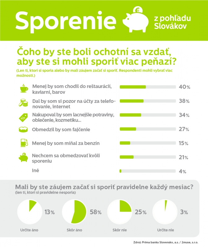 Bratislava, 20. júla 2015 – Pravidelné sporenie je ideálny spôsob na vytváranie finančnej rezervy. Až 7 z 10 Slovákov si odkladá peniaze každý mesiac a väčšina ľudí si myslí, že najvhodnejší čas na založenie pravidelného sporenia je už od narodenia dieťaťa. Vyplýva to z najnovšieho prieskumu Prima banky, ktorý pre ňu zrealizovala prieskumná agentúra 2muse. A čo sú Slováci ochotní obetovať, aby si mohli sporiť ešte viac? Menej by chodili do reštaurácií, kaviarní a barov, znížili by svoje účty za telefón alebo by obmedzili fajčenie.