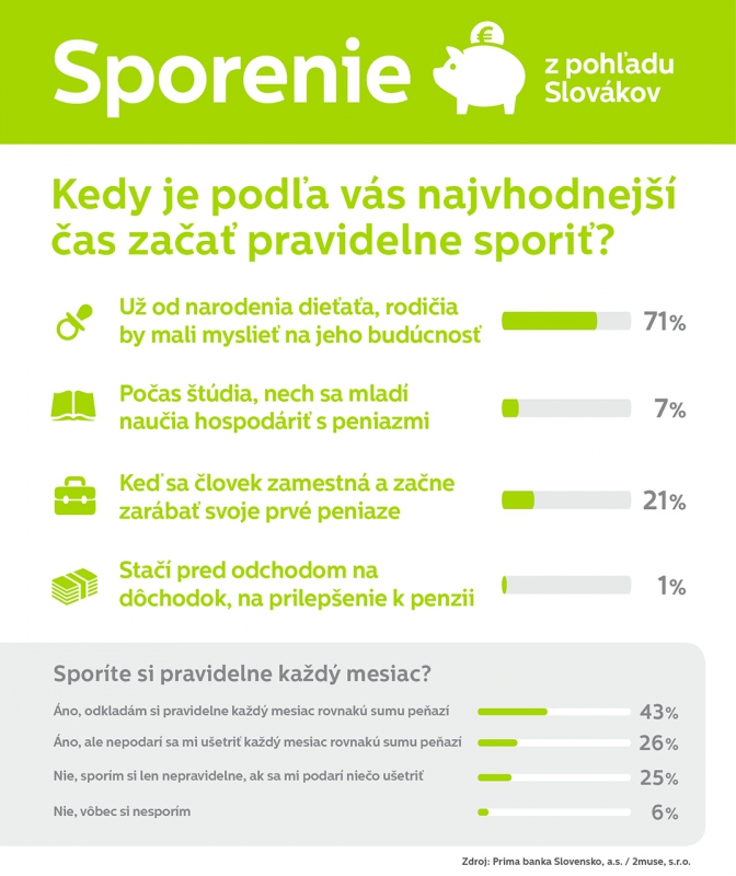 Slováci berú sporenie naozaj zodpovedne. Podľa prieskumu Prima banky až 96 % ľudí považuje pravidelné sporenie za dôležité a 69 % z nás si peniaze odkladá pravidelne každý mesiac. Zásada „čím skôr, tým lepšie“ platí aj pri sporení. Až 71 % Slovákov v prieskume povedalo, že najvhodnejší čas začať pravidelne sporiť je už od narodenia dieťaťa, keďže rodičia by mali myslieť na jeho budúcnosť. Iba 7 % ľudí uviedlo obdobie počas štúdia a pätina by s pravidelným sporením počkala do dospelosti, keď sa človek zamestná a začne zarábať. „Pravidelné sporenie od útleho veku dieťaťa je vynikajúce riešenie pre rodičov, ktorí chcú svojim ratolestiam odkladať peniaze každý mesiac tak, aby to veľmi nezaťažilo ich rodinný rozpočet,“ radí Henrieta Gahérová, riaditeľka divízie riadenia produktov v Prima banke. Rodičia môžu deťom sporiť už od 10 eur mesačne. Postupne sa im po rokoch nazbiera vyššia suma, ku ktorej im banka priráta aj zhodnotenie peňazí vo forme úrokov.