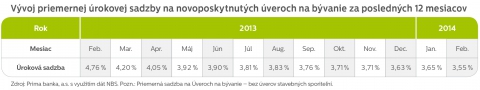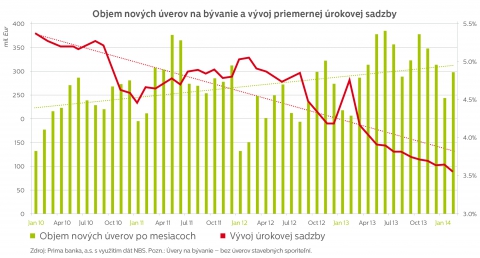 Bratislava, 31. marca 2014 – Vo februári si obyvatelia od našich bánk zobrali nové úvery na bývanie (bez úverov stavebných sporiteľní) v celkovom objeme takmer 300 miliónov eur, čo bolo o 92 miliónov viac ako pred rokom. Priemerná úroková sadzba, za ktorú sme si vo februári požičiavali, klesla na 3,55 % a bola tak najnižšia v histórii.